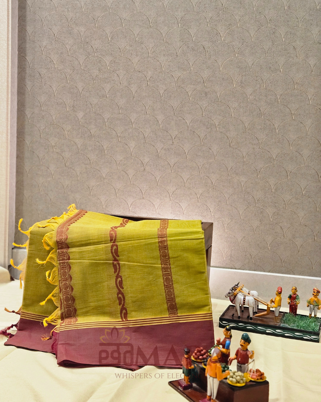The look is beautifully anchored by a deep maroon contrast border, enhanced with fine woven accents that create a striking yet balanced finish. Lightweight and breathable, this saree is ideal for office wear, temple visits, casual festive occasions, and everyday traditional dressing.